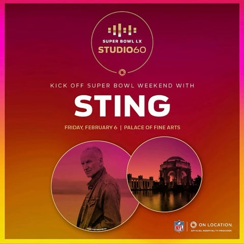 Today, On Location, the Official Hospitality Provider of the NFL, announced that 17x GRAMMY®️ Award-winning artist Sting will headline opening night of On Location and the NFL’s ‘Super Bowl LX Studio 60’ concert series at The Palace of Fine Arts in San Francisco, California on Friday, February 6, 2026. Sting, joined by his STING 3.0 touring band - long-time guitarist, Dominic Miller and dynamic drummer, Chris Maas - will perform the most celebrated hits from his timeless catalog on Super Bowl weekend.